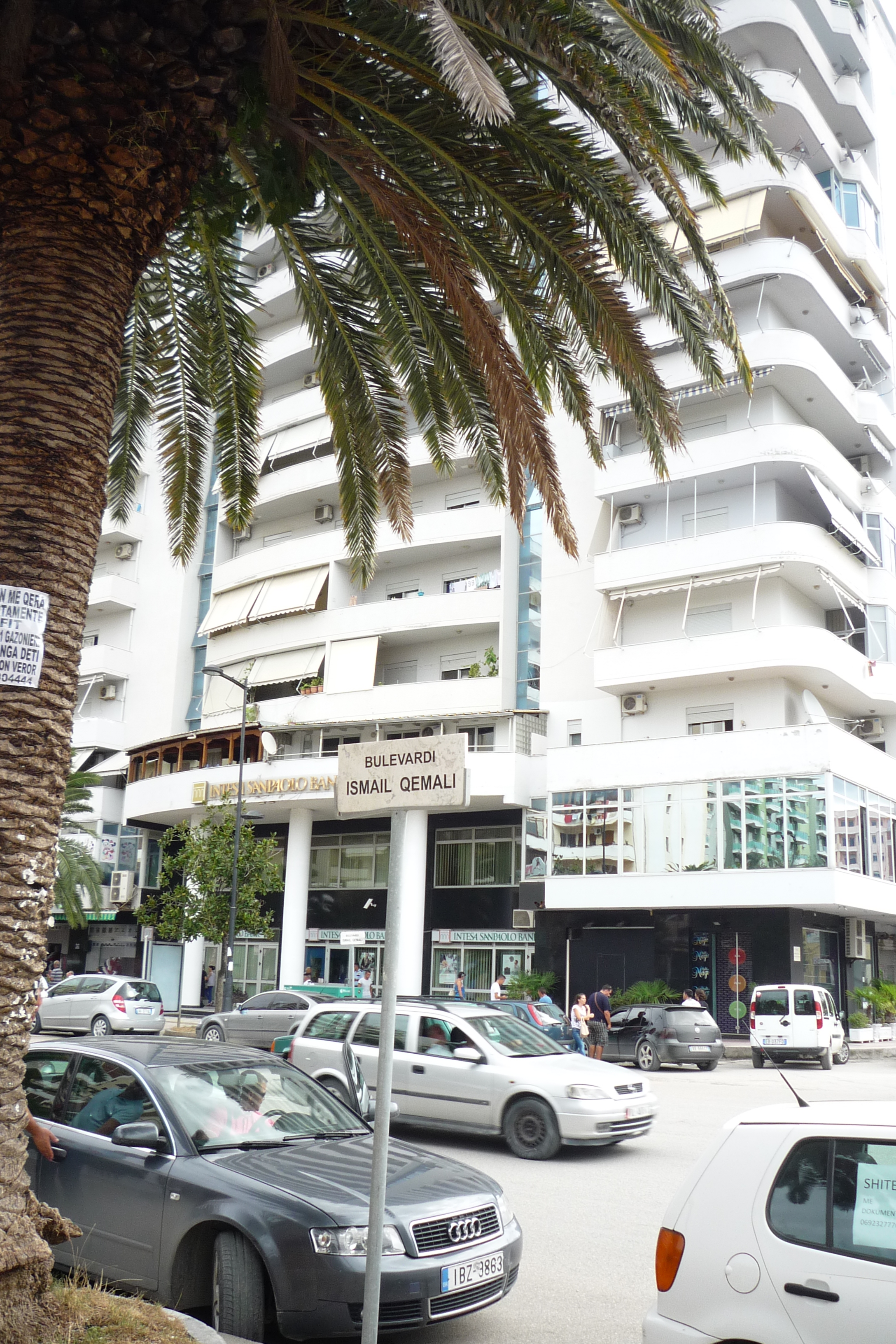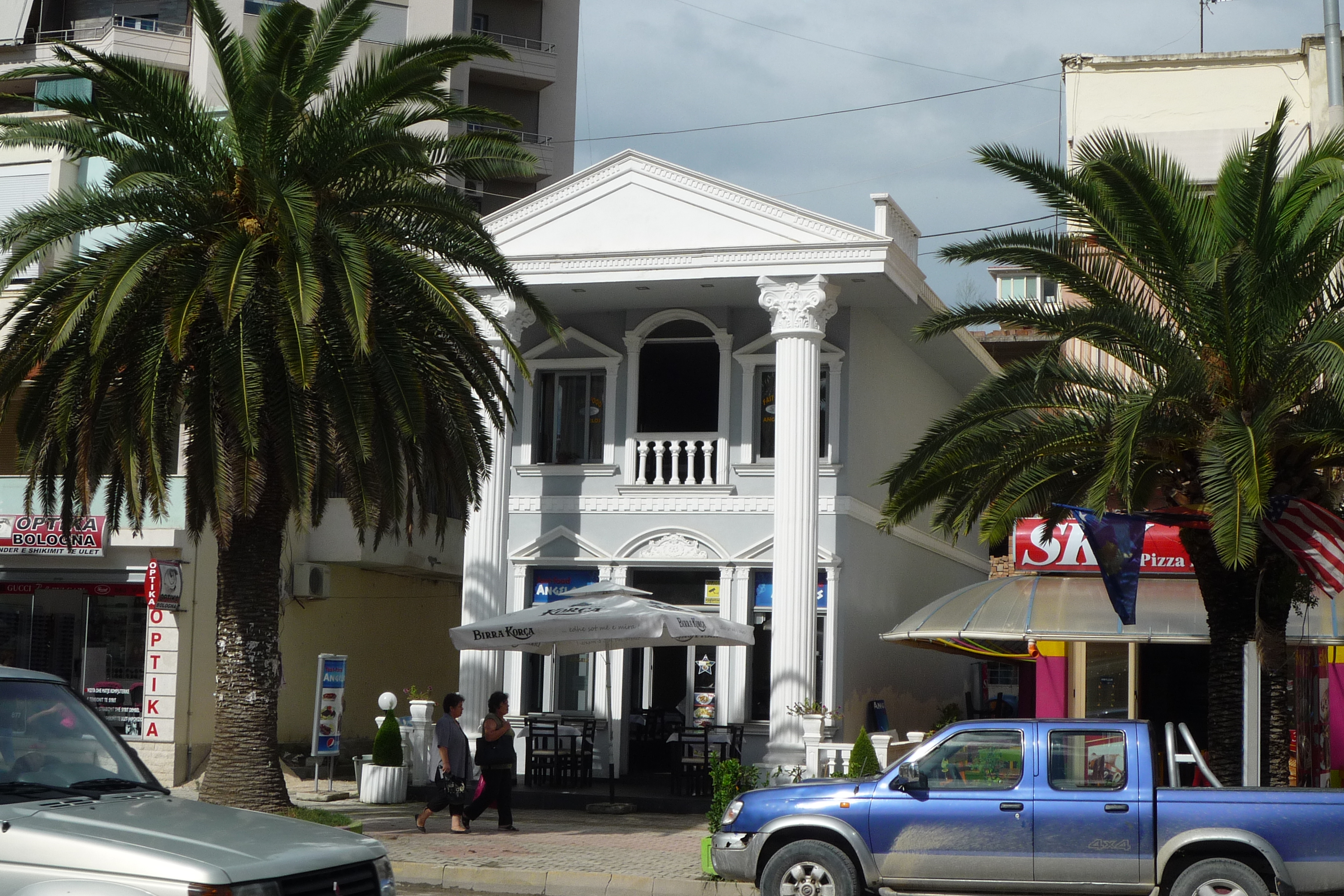 Această cafea am cumpărat-o dintr-un hipermarket de pe bulevardul Ismail Kemali. Mai jos urmează o imagine a bulevardului, cu faimoșii palmieri și un restaurant cochet, cu o intrare antică, cu coloane de templu sprijinind frontonul triunghiular.