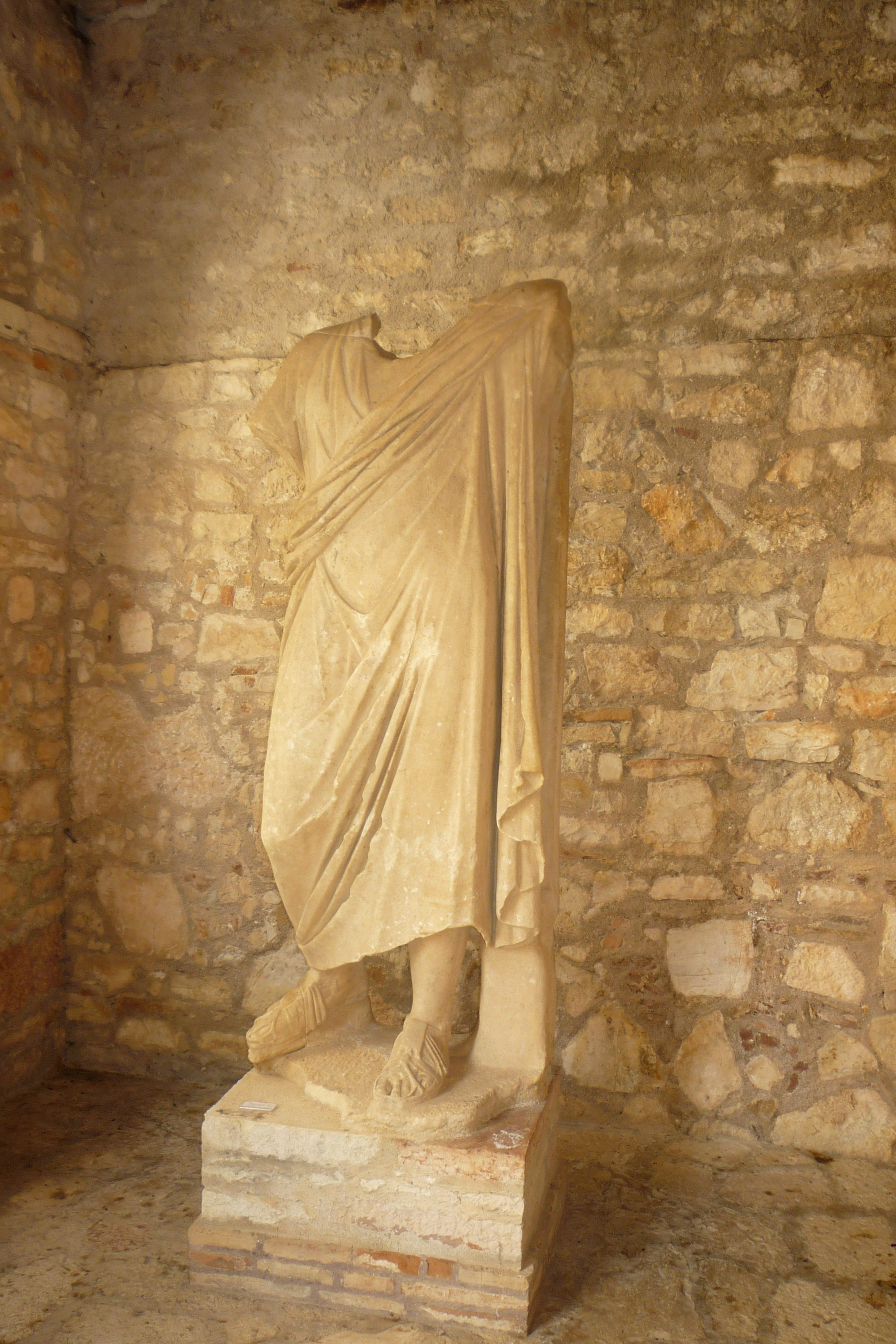 Ai crede că poți auzi foșnetul faldurilor, că poți simți finețea țesăturii…dacă n-ar fi din piatră. Personajul, drapat în togă, a fost găsit în Templul lui Aesculap