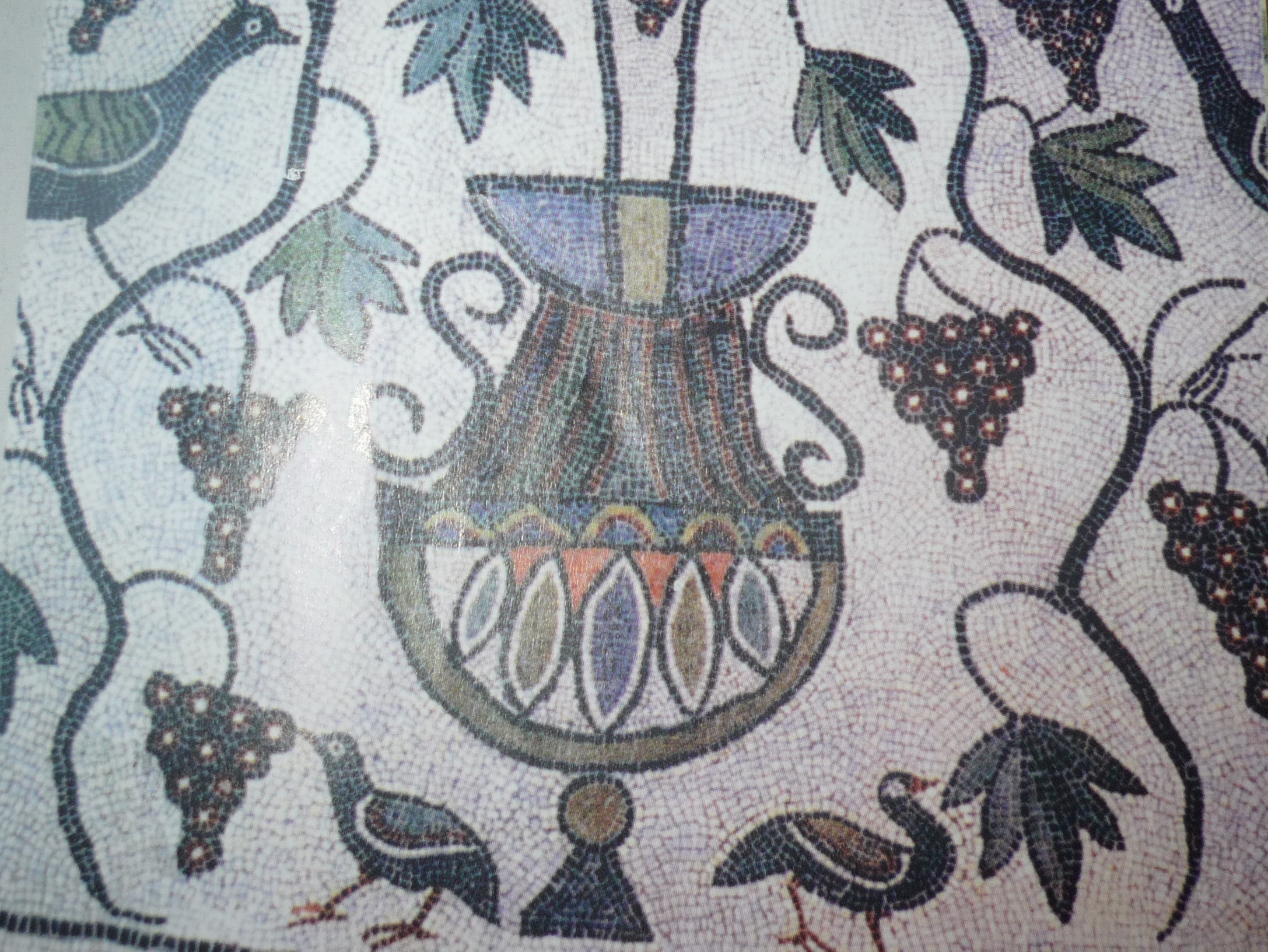 Baptiseriul, datând din secolele v-vi după Christos, cel mai mare și complet vestigiu de acest fel rămas din lumea romană. Fragmentul de mai jos, din mozaicul antic, reprezintă păsări care beau și mănâncă struguri, simboluri ale mântuirii și raiului.
