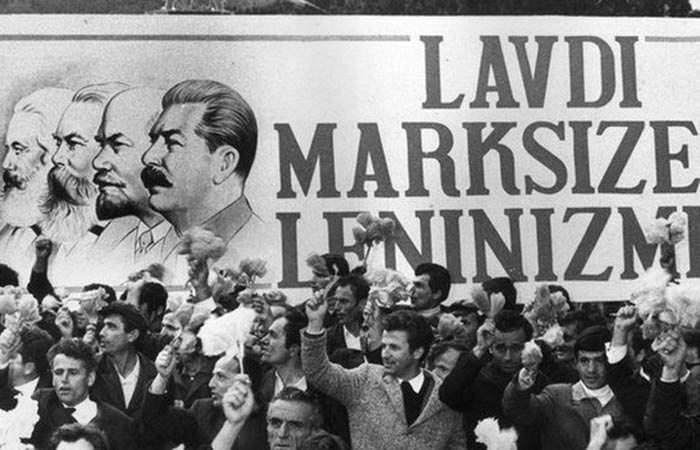 Sub conducerea lui Hoxha (citește și pagina „Enver Hoxha”), Albania a devenit un model extrem al comunismului dogmatic. Rupturile succesive cu aliații ideologici – mai întâi Iugoslavia lui Tito, apoi cu Uniunea Sovietică și în final chiar și cu China lui Mao – au făcut din Albania o „fortăreață roșie” complet izolată. Reforma agrară a desființat proprietatea privată, iar colectivizarea forțată a agriculturii a distrus economia tradițională a satelor albaneze. Industria a fost naționalizată, comerțul cu exteriorul restricționat, iar inițiativa individuală eliminată complet. În numele auto-suficienței și al purității ideologice, țara a renunțat la ajutoarele externe, și-a închis granițele și a interzis orice influență culturală străină.