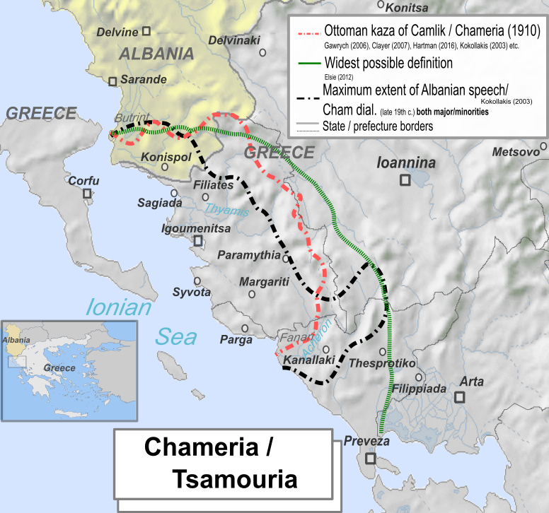 Pentru a-si justifica actiunile abuzive, cercurile şovine grecesti au invocat drept motiv un paralelism făcut între populația çamă și populația arvanită, care respingea în mod evident dreptul istoric al autohtoniei çame, presupunând că aceṣtia au venit în Grecia la fel ca și arvaniții, în diferite perioade ale imperiului bizantin. Acest lucru este valabil doar pentru arvaniți, însă nu și pentru populația çamă, a cărei istorie în această regiune este foarte veche. Însuși istoricul grec Tucidide, referindu-se la Războiul din Peloponez, relatează că atunci când forțele ateniene au pătruns în Golful Ambracia, au întâlnit o populație locală care nu vorbea greacă, ci o limbă barbară.