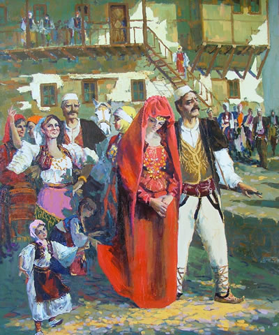 în dimineața nunții, mireasa era pregătită cu cântece rituale, iar prietenele și femeile din familie cântau așa-numitele „cântece de nuntă” (këngë dasme), unde melancolia despărțirii se împletea cu speranța unui nou început pentru tânăra fată. Aceste cântece, consemnate de etnografii albanezi încă din secolul al XIX-lea, sunt considerate printre cele mai autentice expresii ale poeziei populare albaneze.